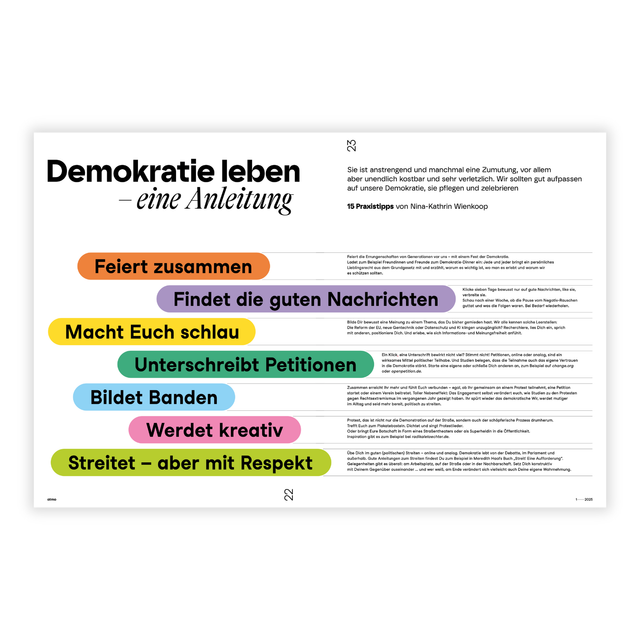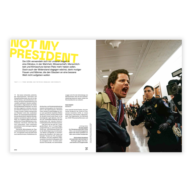 Die atmo-Premiere: ein Heft über Menschen, die in widrigen Zeiten den Mut nicht verlieren. Die sich gegen den grassierenden Populismus und den ökologischen Backlash zur Wehr setzen. Die unbeirrt für die Energiewende und für Menschen in Not einstehen. Ein Heft über all jene, die sich „trotzdem“ engagieren, ob in den USA oder in Deutschland. Mit 15 Tipps zum Thema „Demokratie leben“, einer Anleitung „Was tun, wenn jemand aus der rechten Ecke auf die Energiewende losgeht?“ und einer spannenden Debatte: Carla Hinrichs und Heinrich Strößenreuther diskutieren über die Zukunft des Klimaaktivismus.