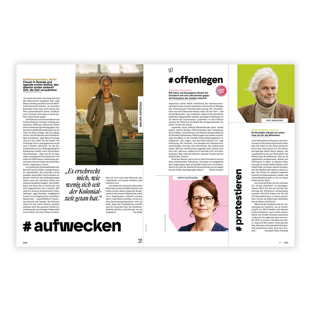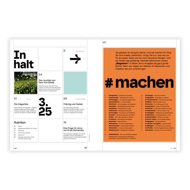 Was wäre die Welt ohne jene, die zupacken? Ohne die, die mit neuen Ideen, Tatkraft und gesundem Optimismus an einer besseren Welt werkeln – in Initiativen und Vereinen, in Start-ups und Kooperativen? atmo No. 3 ist ein „Wegweiser spezial“: Wir haben jenen Heldinnen und Helden des Alltags, mit denen wir sonst ins Heft starten, einen ganzen Schwerpunkt gewidmet. Wir stellen Menschen wie Mary Madalo Harawa vor, die in Malawi als „Königin der Gärten“ altes Gemüsewissen an junge Menschen weitergibt. Wie Dominik Bloh, der in Hamburg Deutschlands ersten Duschbus für Obdachlose auf die Räder stellte. Oder wie Sebastian Rakers, der „Fisch ohne Fisch“ herstellen kann. Ein Heft, das aktiviert – und Hoffnung #macht.